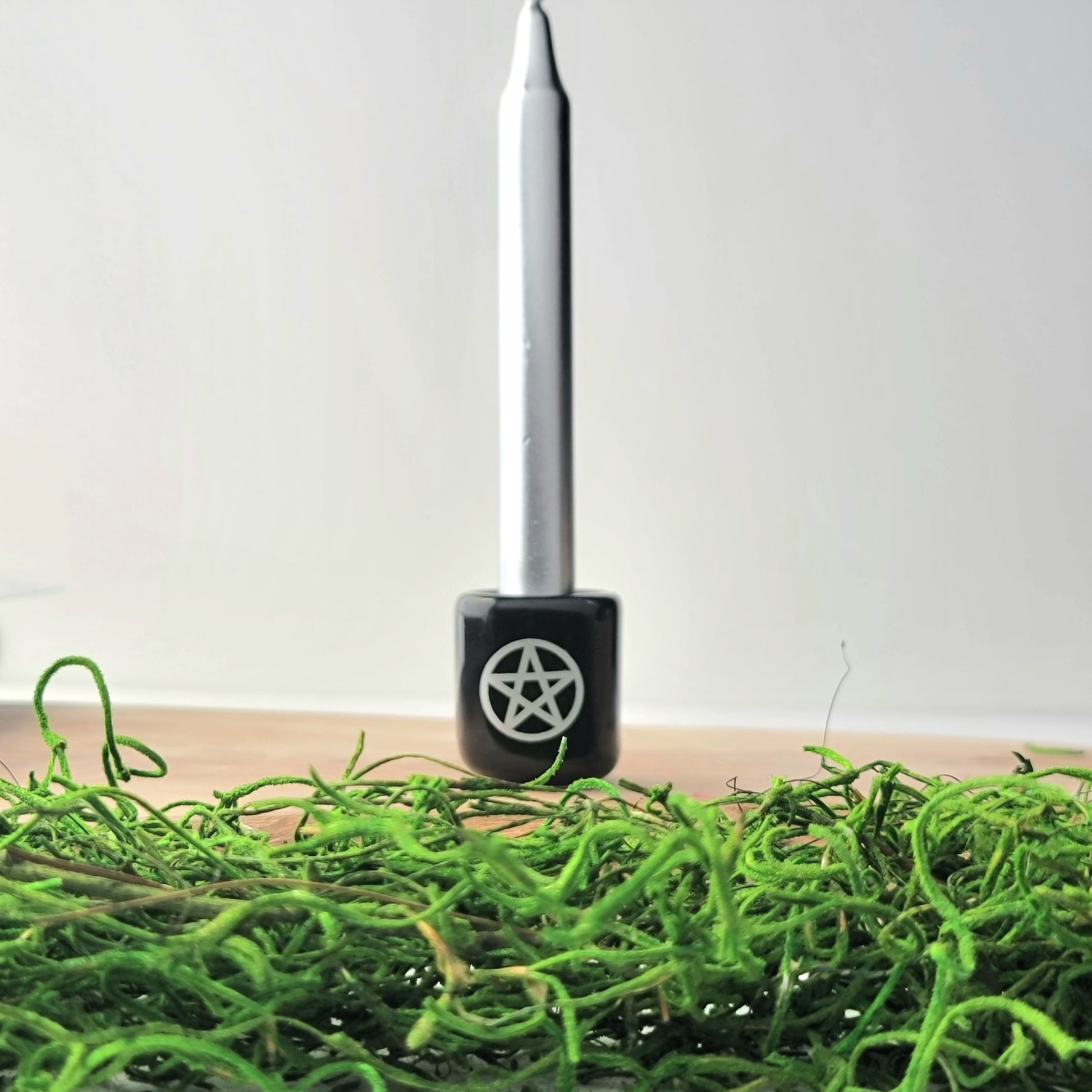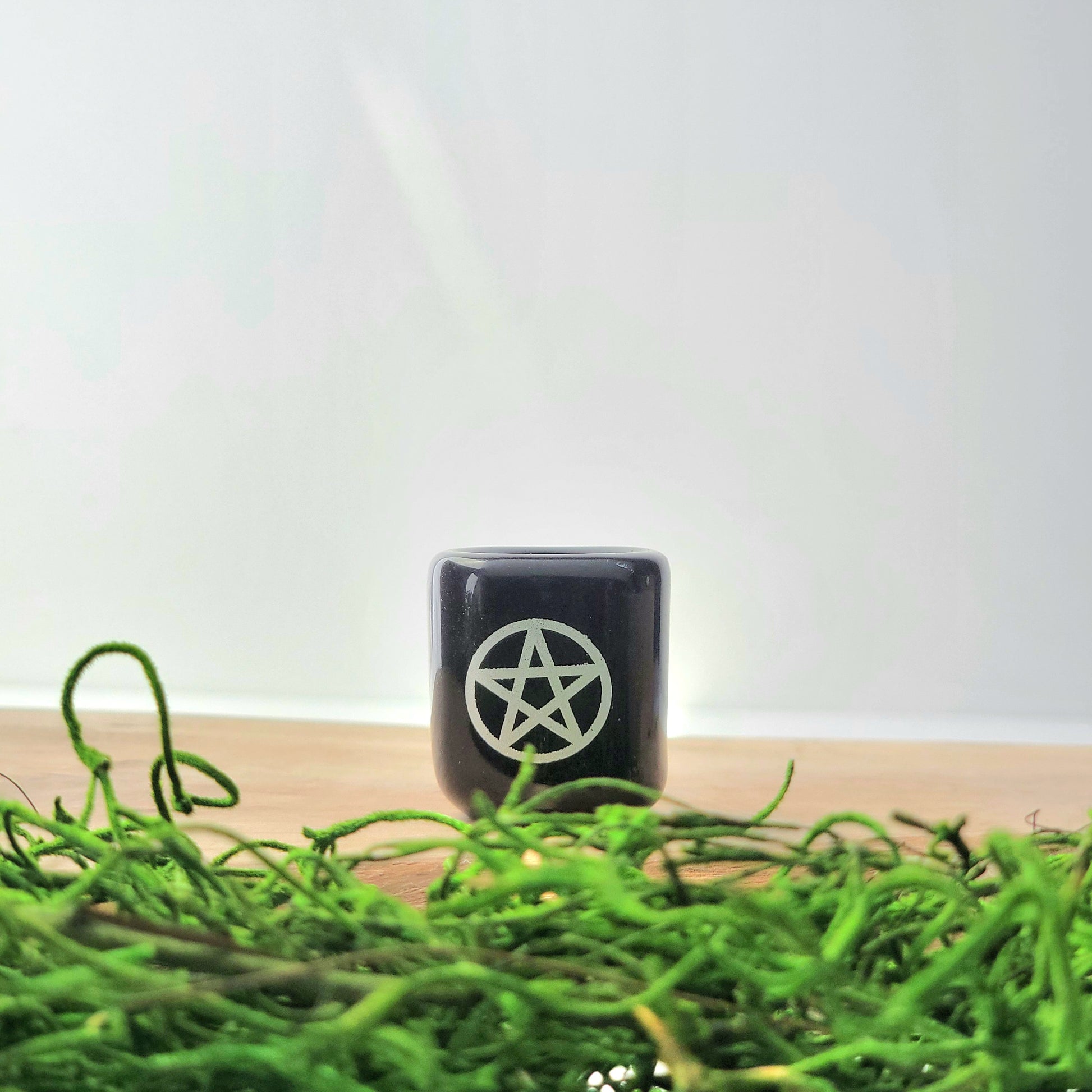 This small Chime Candle Holder, will make a practical addition to your sacred space. Crafted from durable ceramic, this 1.5-inch holder features a sleek black finish with a shimmering silver pentacle. Perfect for chime candles, it provides a stable platform for rituals and meditations.